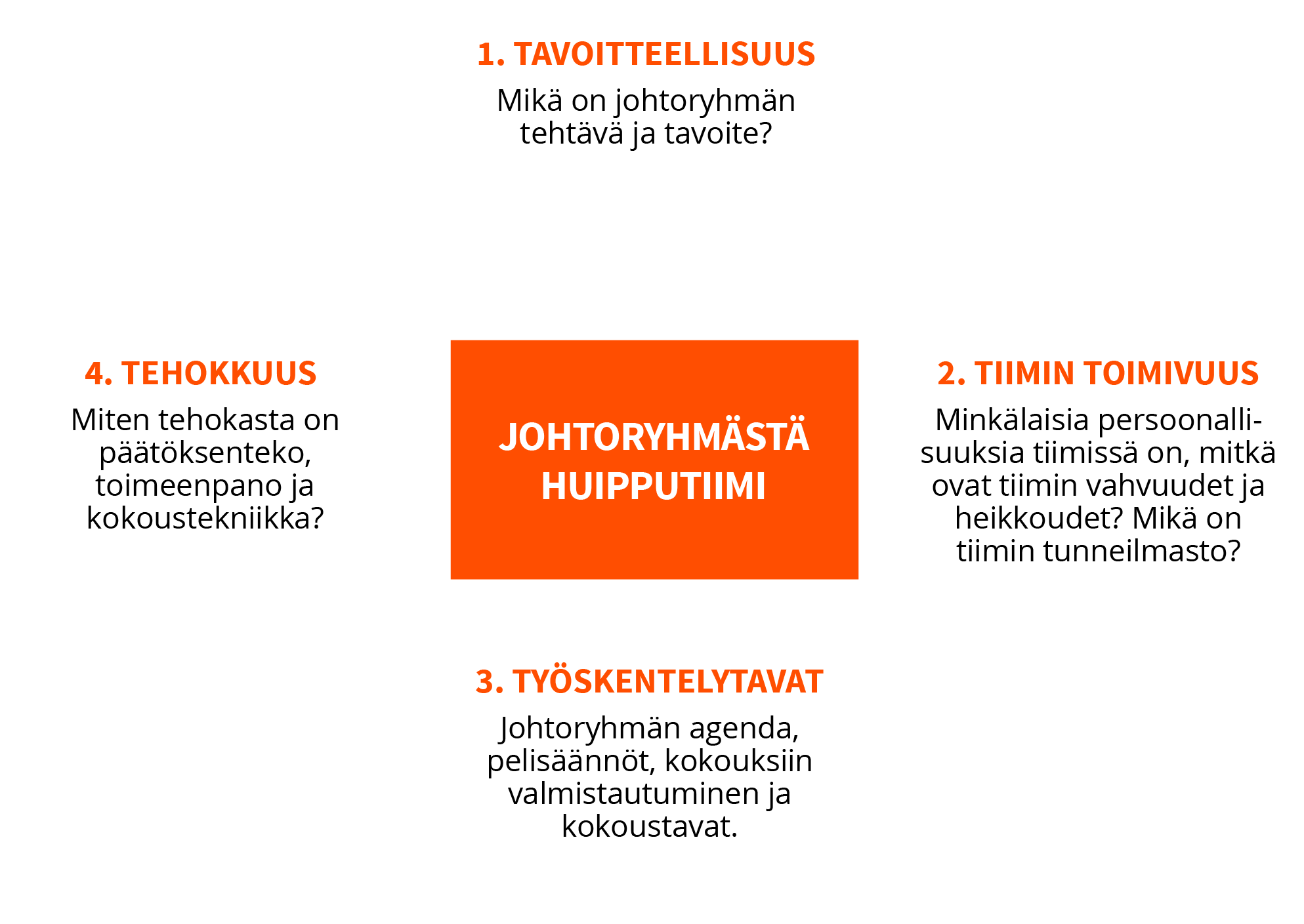 Johtoryhmä on yrityksen tärkein ja kallein tiimi. Tämän johdosta johtoryhmän tulisi olla huipputiimi, jonka työskentely energisoi jäseniään ja vaikuttaa ympäristöönsä innostavasti. Hexum käyttää johtoryhmien kehittämisessä 4T-mallia. Mallin nimi tulee sanoista tavoitteellisuus, toimivuus, työskentelytavat ja tehokkuus. Malli ottaa huomioon johtoryhmän sekä tiiminä että yksilöinä. Jos haluat kehittää johtoryhmästäsi huipputiimin tai sparrata asioita, niin ota yhteyttä.